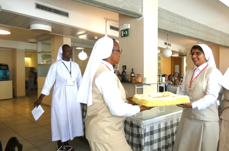 O Cardeal falou do Evangelho sobre o perdão. O perdão é um instrumento precioso necessário em cada um para construir uma comunidade fraterna. A vida religiosa é seguir Cristo, JUNTOS. É caminhar junto com a nossa bela diversidade, pois sabemos que a unidade se constrói na diversidade. É neste contexto que formamos a vida fraterna e, exercemos a correção fraterna, se é necessário. Sublinhou o papel do Evangelho na vivência do nosso caminhar juntos em comunidade. Temos necessidade de deixar o Evangelho entrar nas nossas vidas e ver a situação através das lentes do Evangelho. É a partir do Evangelho que podemos viver em harmonia. Depois da missa, saudámos o Cardeal e partilhámos uma refeição festiva.