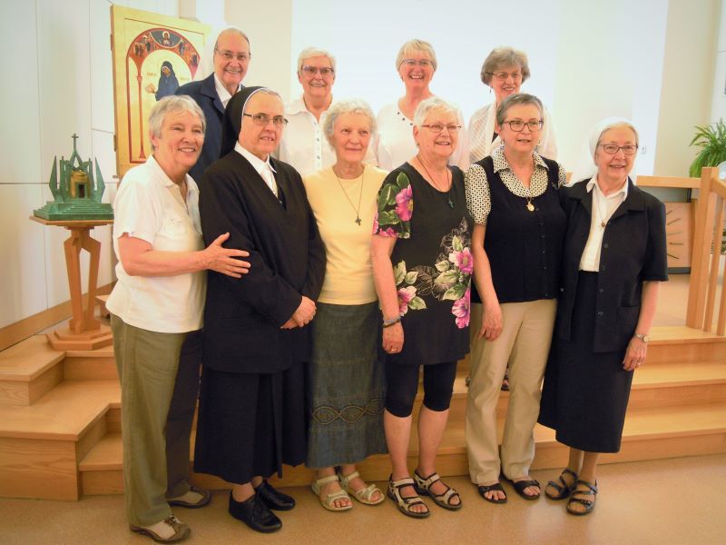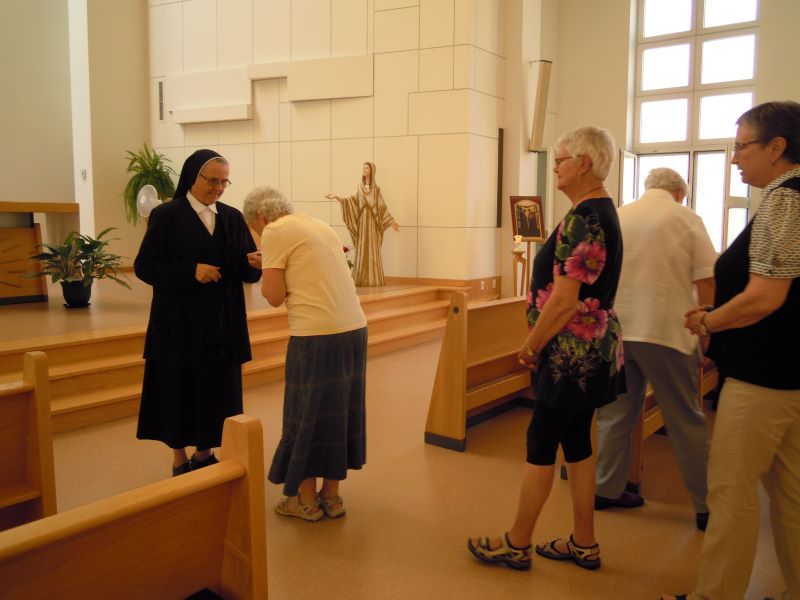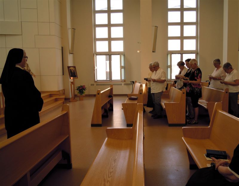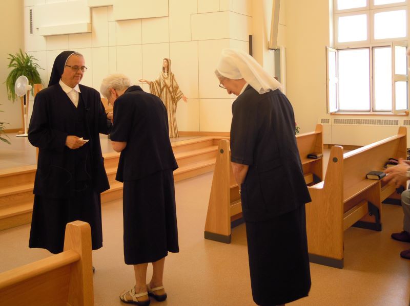 En après-midi, lors de la célébration de Vêpres, les consacrées de la province du Québec ont renouvelé leur vœu de chasteté en présence de notre supérieure générale qui, pour la première fois, présidait un engagement de personnes consacrées. Nous pouvions sentir et partager la ferveur de ces dames engagées sur les pas de sainte Marie Rivier. À la fin de la célébration, Mère Marie des Anges a fait vénérer la croix de Marie Rivier aux consacrées et aux sœurs qui assistaient à Vêpres.
