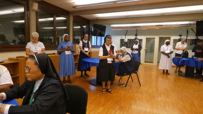 A celebração da manhã foi composta por três momentos: celebrar com a Virgem Maria, as suas Virtudes e a celebração da Sagrada Eucaristia. Todos nós sabemos que Marie Rivier tem títulos especiais da Santíssima Virgem Maria. Alguns deles eram: Nossa Senhora do Sorriso, Nossa Senhora do Puy e Nossa Senhora da Apresentação. Divididos em diferentes grupos, dedicámos o tempo em estar com cada uma das imagens de Nossa Senhora que representam os títulos acima referidos tendo um guião de oração previamente preparado com atividades criativas de oração. Cada peregrinação deu-nos a oportunidade de refletir sobre as relações de Santa Maria Rivier com a Virgem Maria.