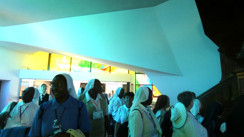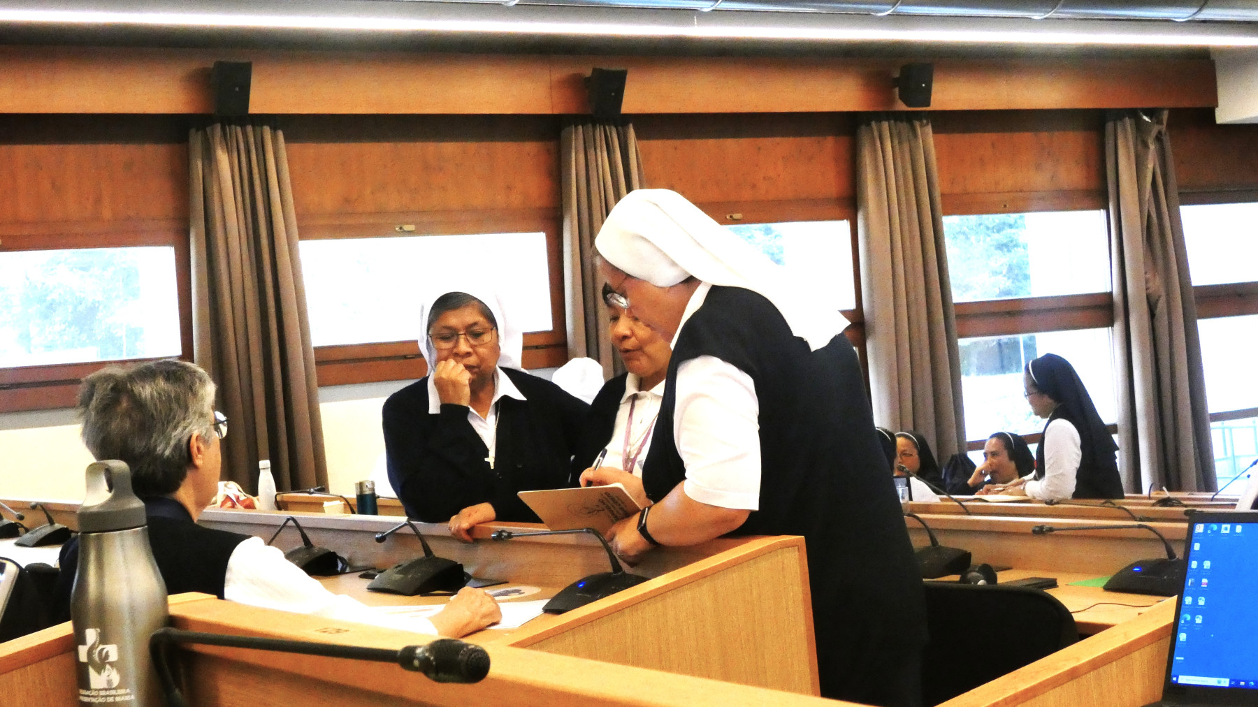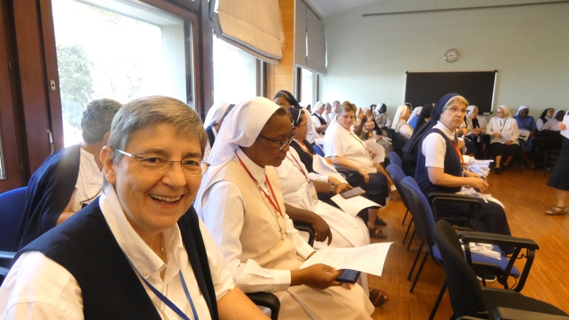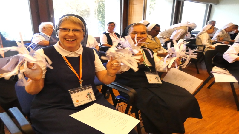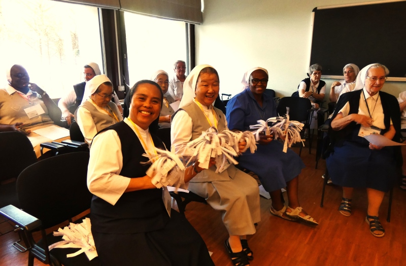 Cambiamos la orientación y nos centramos en dar gracias a todas las personas que han hecho de este Capítulo una experiencia intercultural rica de experiencias . Algunas de nuestras Hermanas, muy creativas, organizaron las expresiones de gratitud como si los que eran agradecidos fueran invitados a un episodio de «PM TV». Las locutoras tocaron con entusiasmo al público para provocar vítores, golpes de tambor e incluso algo de baile. Cada Hermana expresa su gratitud a las personas que le han servido durante el Capítulo. Una de nuestras Hermanas senegalesas hizo un anuncio publicitario en el que anunciaba de forma consecutiva las distintas bebidas calientes y tentempiés que tuvimos a nuestra disposición a lo largo del Capítulo. Consiguió atraer al público hablando en los cinco idiomas de la Congregación, incluido el japonés, que se inventó, y el resultado fue cómico… ¡¡¡un auténtico anuncio!!!