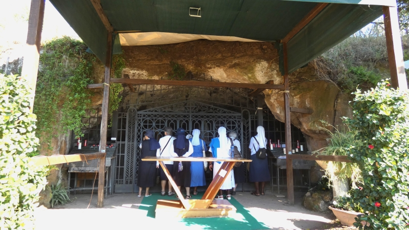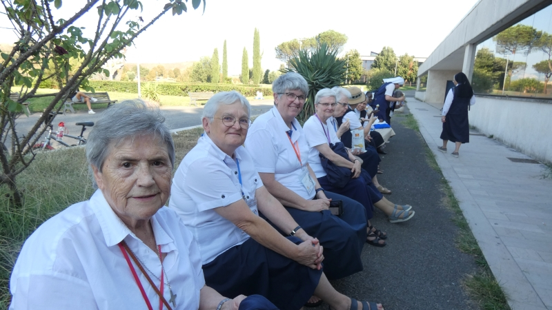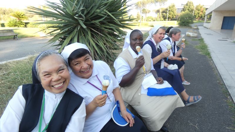 Esta tarde viajamos a un santuario cercano, el Santuario de Nuestra Señora del Divino Amor. Este santuario rinde homenaje a Nuestra Señora por sus intervenciones en favor del pueblo romano, a través de un fresco milagroso, que data de 1740. Juntos rezamos el rosario en cinco idiomas en la iglesia principal del santuario. Después, sintiendo el calor del día, disfrutamos agradecidos de un helado, cortesía de la Madre Maria dos Anjos.