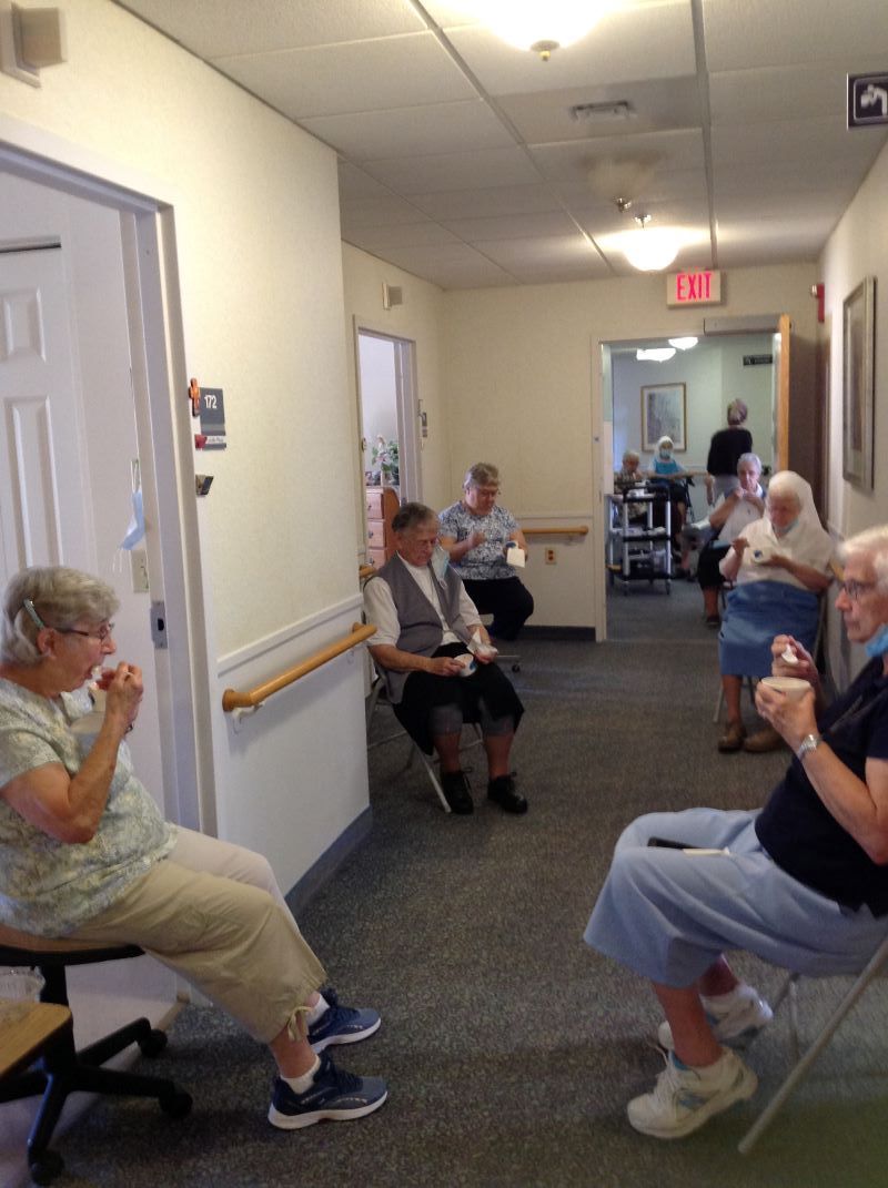 Each morning, we receive a menu from the kitchen.  We choose what we want to eat for the day and it is delivered to our bedroom where all meals take place.  The only other place we can go in the building is our chapel.  We have had no Mass or communion for over 4 months.  Our Activity Director, Cindy, has been very good to us.  To break the monotony and stimulate a bit of socialization, she leads various activities as we sit in our bedroom doorways, six feet apart, for an hour or so each afternoon.  In the photos we are enjoying an ice cream treat.  Sometimes, we play “BINGO.”  At other times, she leads us in a variety of physical exercises.  While normal community events are suspended, we Praise God for this gift of being able to socialize.