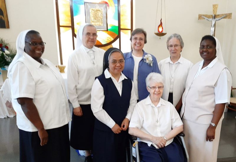 Le 16 juillet, en la fête de Notre-Dame du Mont Carmel, nous avons communié à l’action de grâce de Sister Kelly Connors, conseillère générale. Nous appartenons à une famille internationale à laquelle nous nous sommes données totalement en nous consacrant au Seigneur et au service de l’Église. D 3. La journée festive a commencé par une messe internationale présidée par Père Henri, Oblat de Marie Immaculée. L’ordinaire de la messe était en italien et les chants en français, anglais, portugais. Au rythme du tam-tam, nous avons fait monter nos louanges et notre reconnaissance à Dieu qui a l’initiative de l’appel… qui inspire la réponse… qui donne en même temps la capacité de se livrer à son mystère et de consentir, avec une liberté joyeuse, à toutes les ruptures que suppose l’accueil de ce don. C 114