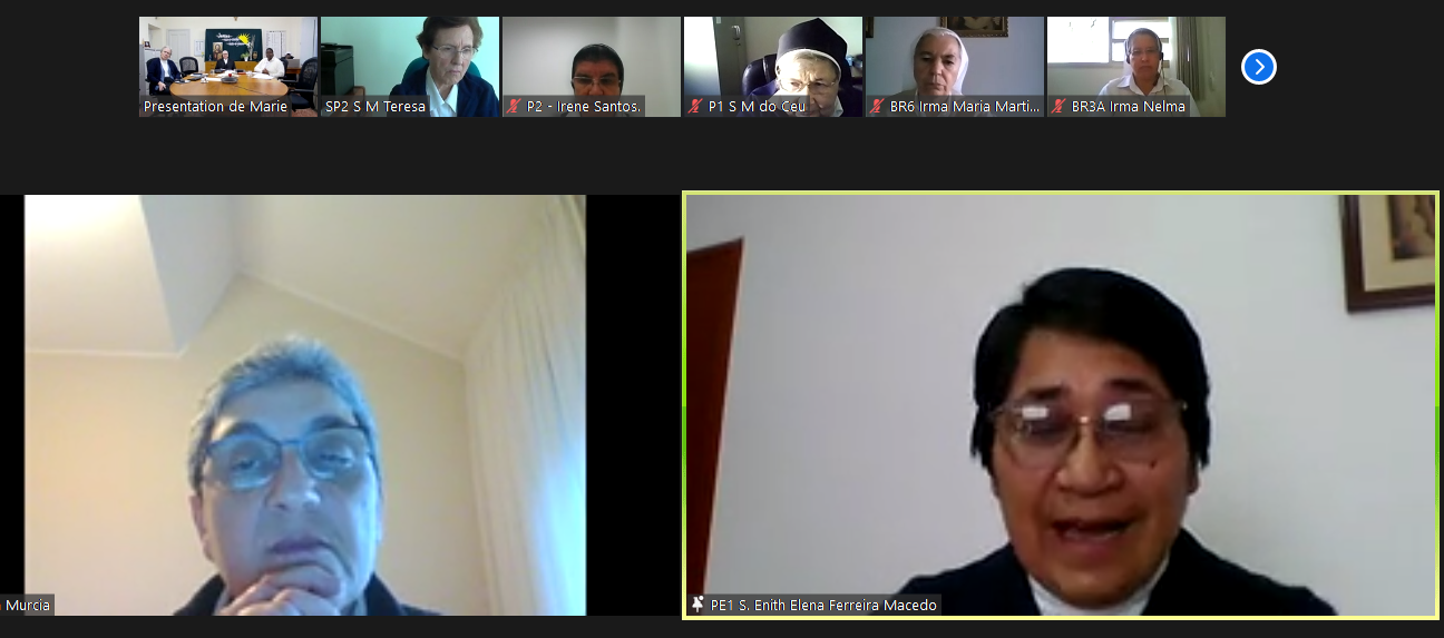La sesión comenzó con una presentación en vídeo de los participantes y una oración de apertura sobre el tema: JUNTAS, HACIA EL FUTURO. La Madre María dos Anjos abrió oficialmente nuestra sesión con su mensaje de bienvenida y nos dio orientaciones para nuestra reunión que se considera como un Consejo ampliado de la Congregación. Su mensaje nos abrió el camino para nuestra reflexión y compartir.