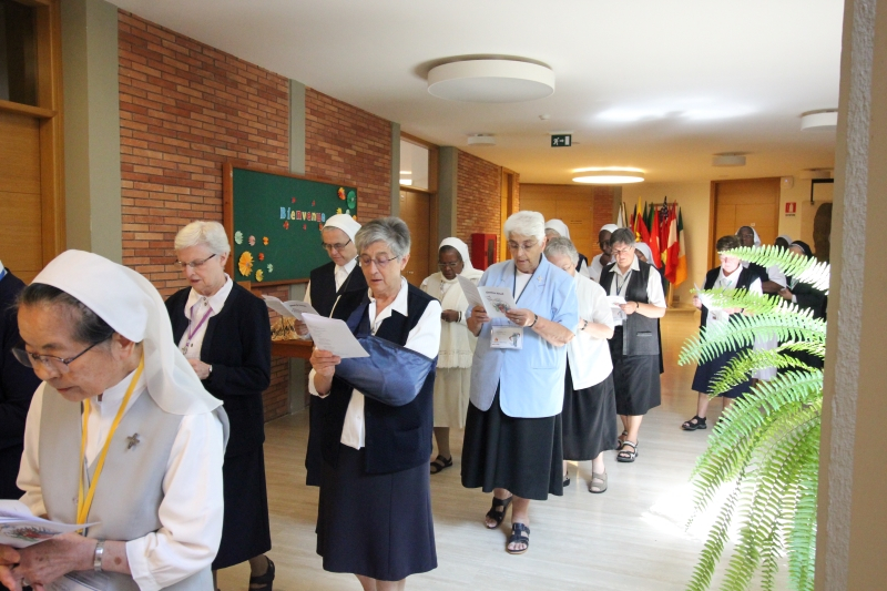 Aujourd’hui, nous avons commencé la journée avec la Croix de Marie Rivier sur l’autel. Quelle émouvante célébration hier soir, avec la participation de tous les pays !