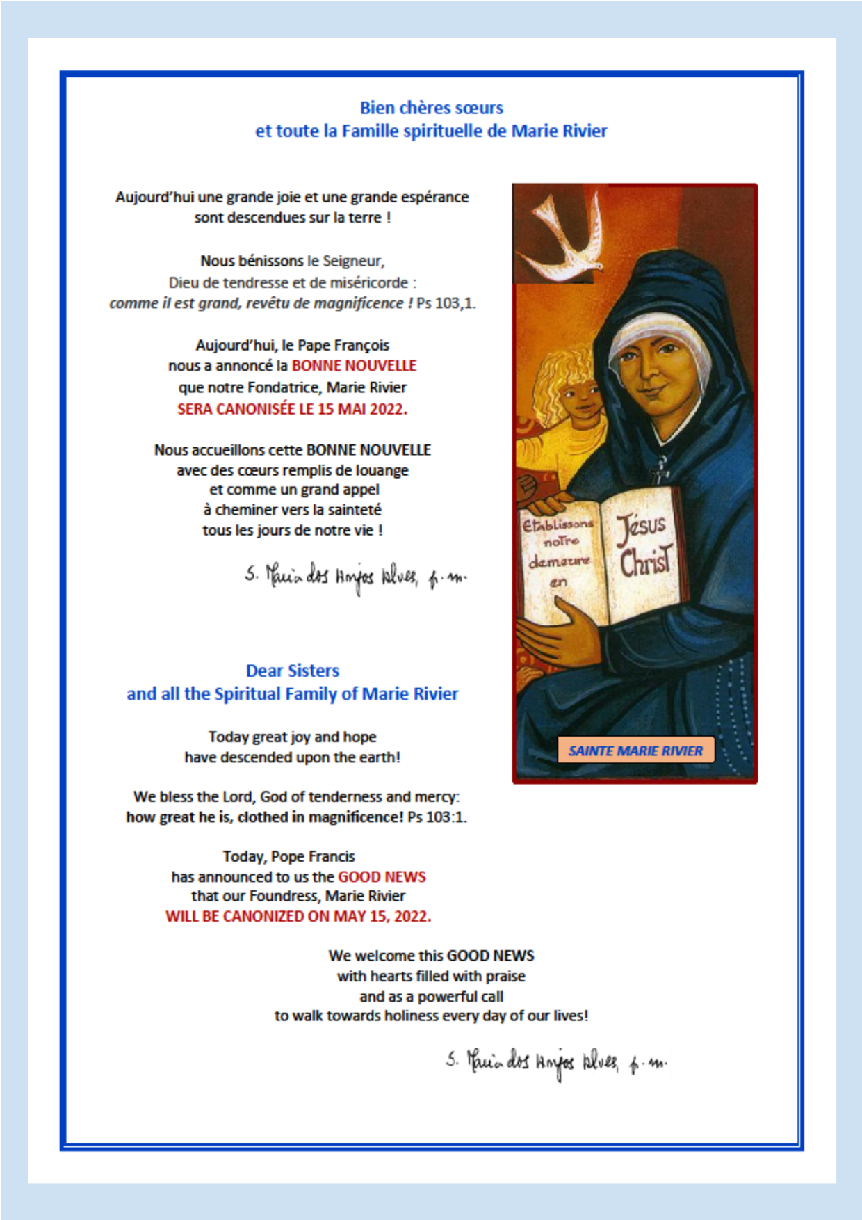 L’annonce de la date de canonisation de Mère Rivier