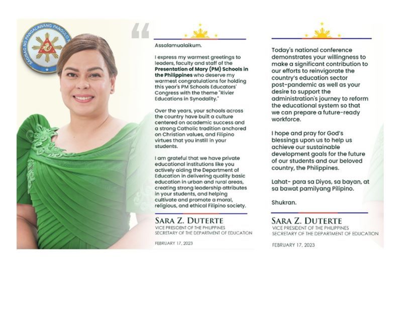 The PM Sisters, administrators, faculty, and staff of the nine (9) PM schools in the Philippines joined together for a day of camaraderie, unity, and synodality as they celebrated the PM Educators’ Congress 2023 on February 17, 2023 at Saint Michael’s School of Padada in Padada, Davao del Sur. With the theme, “Rivier Educators in Synodality”, the approximately 400 PM educators from St. Peter’s College of Toril Inc., Holy Cross College of Calinan, Inc., Holy Cross of Mintal, Inc., Saint Michael’s School of Padada, Inc., Holy Cross of Malita, Inc., Holy Cross of Sta. Maria, Inc., Holy Cross of Malalag, Inc., Notre Dame of M’lang, Inc., and Presentation Academy of Clarin, Inc. gathered to listen to the