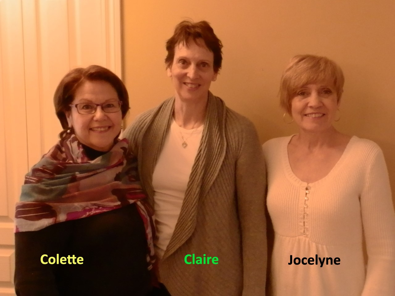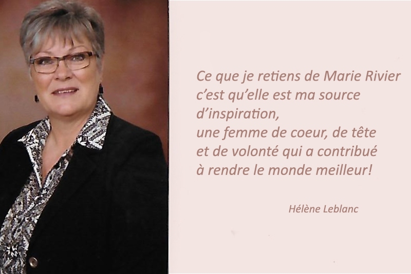 - Jocelyne Dumoulin, Colette Gaucher, Claire Massicotte, ex-enseignantes à l’École Présentation-de-Marie de Granby, participantes à l’équipe Marie-Rivier qui rencontre les élèves de 1re et 5e du cours secondaire des Collèges Rivier, Saint-Maurice et Reine-Marie, chaque année.