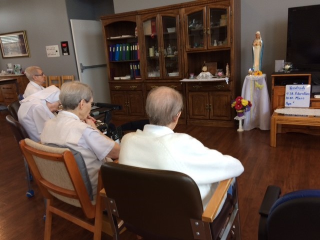 When the priest celebrates the Eucharist with us, the Front Room becomes our big chapel. On the days we do not have mass, we unite ourselves to the Communion of Saints via the Daily TV Mass.